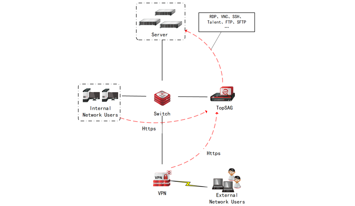 Administrators can implement internal operation and maintenance management as well as compliance auditing by deploying a single TopSAG.Internal network users can directly access the TopSAG for operation and management via internal O&M terminals;External network users can either dial into the internal network environment through VPN or access the TopSAG web interface via port forwarding of the TopSAG via port mapping, so as to achieve convenient and secure operation and maintenance management.