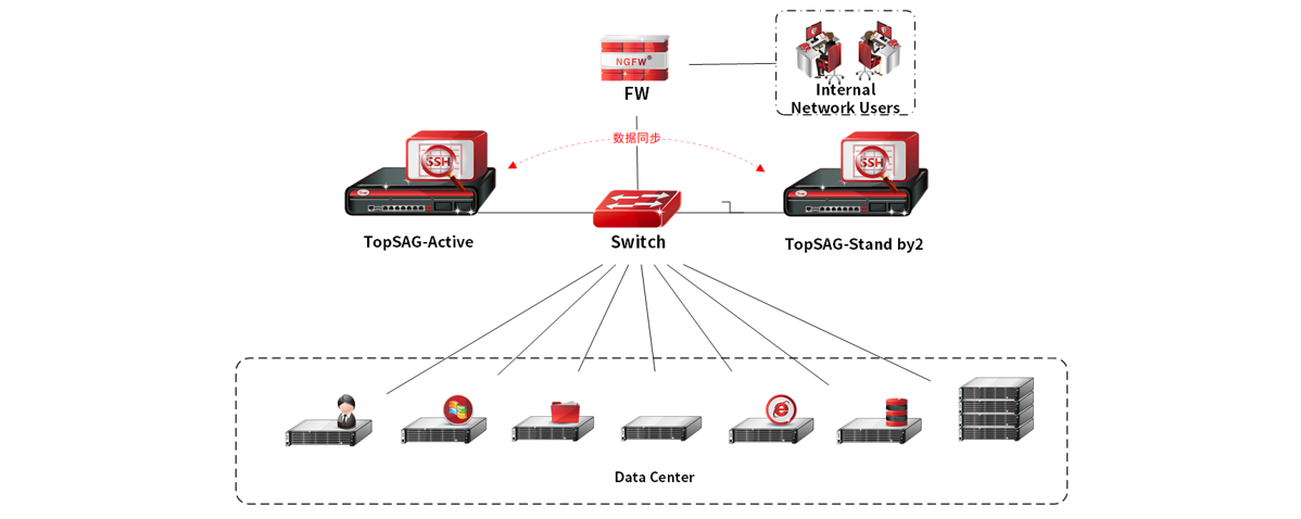 Users access TopSAG through its virtual IP address, while the system automatically performs data synchronization and redundant backup.