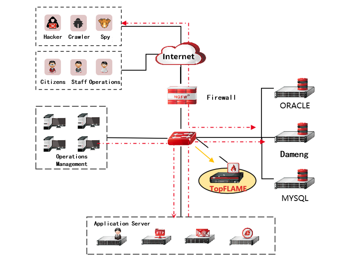 Topsec Flame Threat Detection System (TopFLAME) is a new-generation probe-type threat detection system primarily designed for high-precision threat detection in small to medium traffic scenarios. Its application scenarios include: serving as the detection engine for XDR, acting as a high-precision detection tool for cybersecurity exercises (HW), functioning as the detection engine for the Topsec AI model, and complementing the threat detection capabilities of firewalls. The product integrates multiple threat detection databases, including threat intelligence libraries, advanced threat libraries, botnet host rule databases, attack detection rule databases, web security detection rule databases, virus rule databases, application identification libraries, geographic information libraries, URL classification libraries, and asset identification libraries. By combining these ten intelligent rule databases, TopFLAME establishes a new paradigm for proactive defense, ensuring that no threat can evade detection.