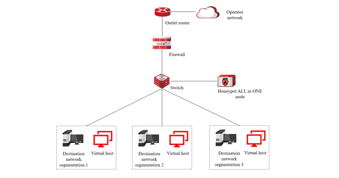 In the SME network scenario, generally the network structure level is relatively simple, the physical location is single, and the intranet traffic is small, it is recommended to use ALLinONE mode to deploy in the network that needs to be protected, disguised as a business system run by the user, and a single device can complete the deployment of the whole network honeynet.