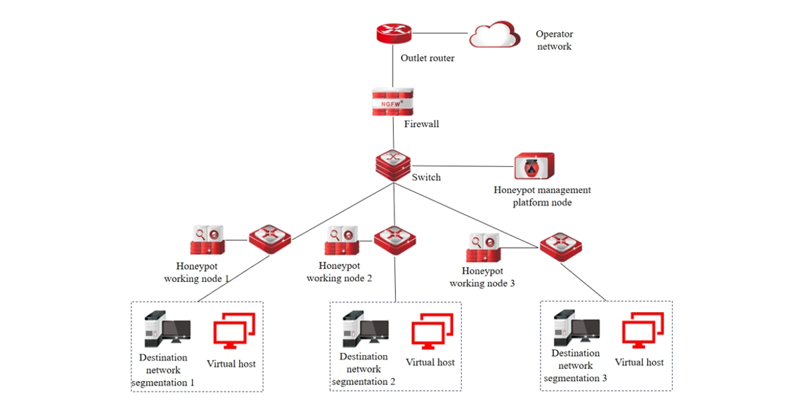 Adopting the advanced technology of network virtualization and process simulation, it supports the generation of multiple virtual hosts on a single device, which can quickly complete the construction of high-density trapping environment and enable the construction of low-cost large-scale honeynet.